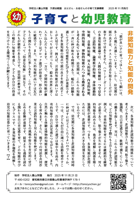 一般向け 子育てと幼児教育 2025年11月 2025年11月21日 sitemaster 天使幼稚園では、未就園児のお子様、また子育てに奮闘されている保護者の皆様向けに、「子育てと幼児教育」と題したリーフレットを配布しています。下記からオンラインでダウンロードできます。是非、ご覧ください。 お父さん・お母さんの子育て支援情報「子育てと幼児教育」
